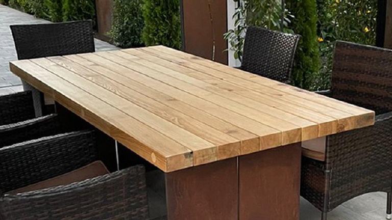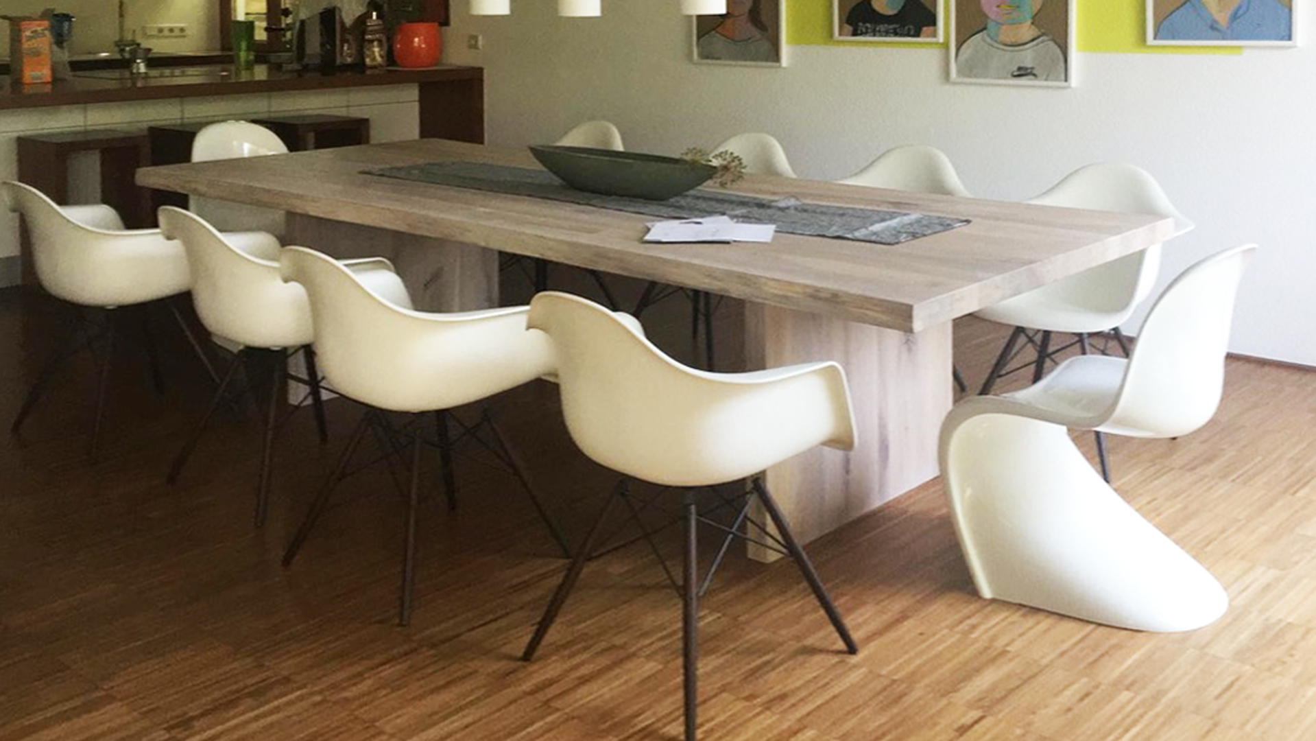 Tische in Lamellenoptik werden aus einzelnen Massivholz Leisten zusammengefügt.