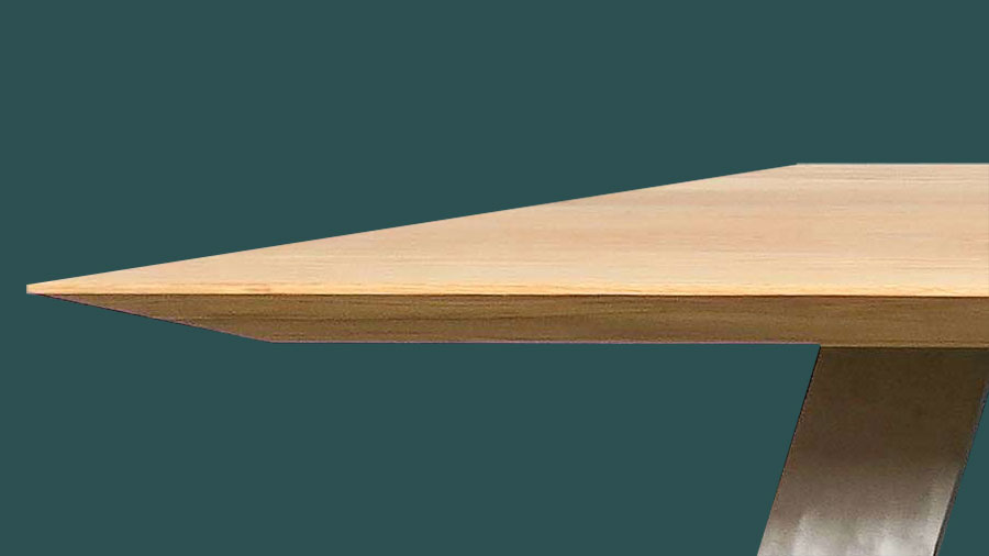 Die Schweizer Kante (auch Facettenkante) bezeichnet einen Schrägschnitt im vorgegebenen Winkel um die Kanten der Tischplatte. Der erste Teil der Tischkante ist wenige Millimeter stark, der Rest verjüngt sich im indivuellen Schweizer Kante Winkel nach unten und nach hinten.
